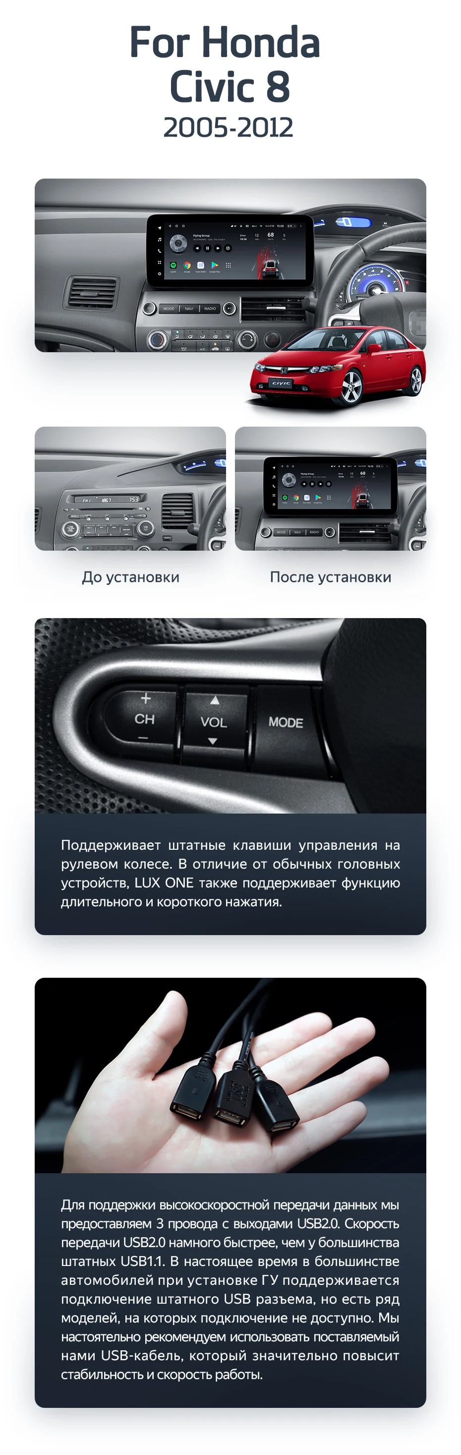 Готовый установочный комплект для магнитолы Honda Civic 8 FK FN FD (2005-2012) Правый руль 12,3 дюймов в штатное место, включает переходную рамку и проводку.