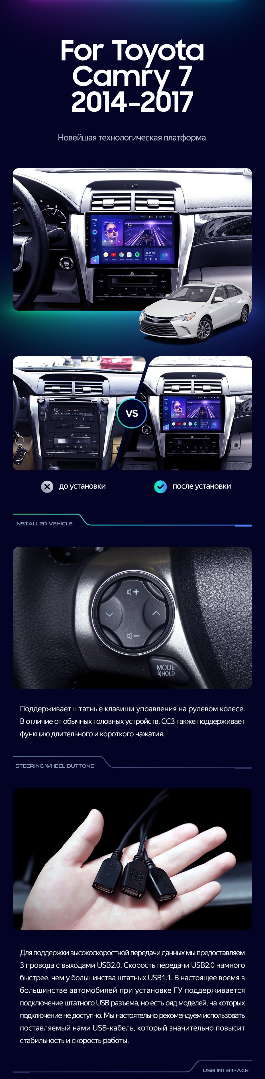 Полный комплект установки магнитолы Teyes с рамкой и проводкой можно выбрать в каталоге штатных магнитол Toyota Camry 7 XV 50 55 (2014-2017).