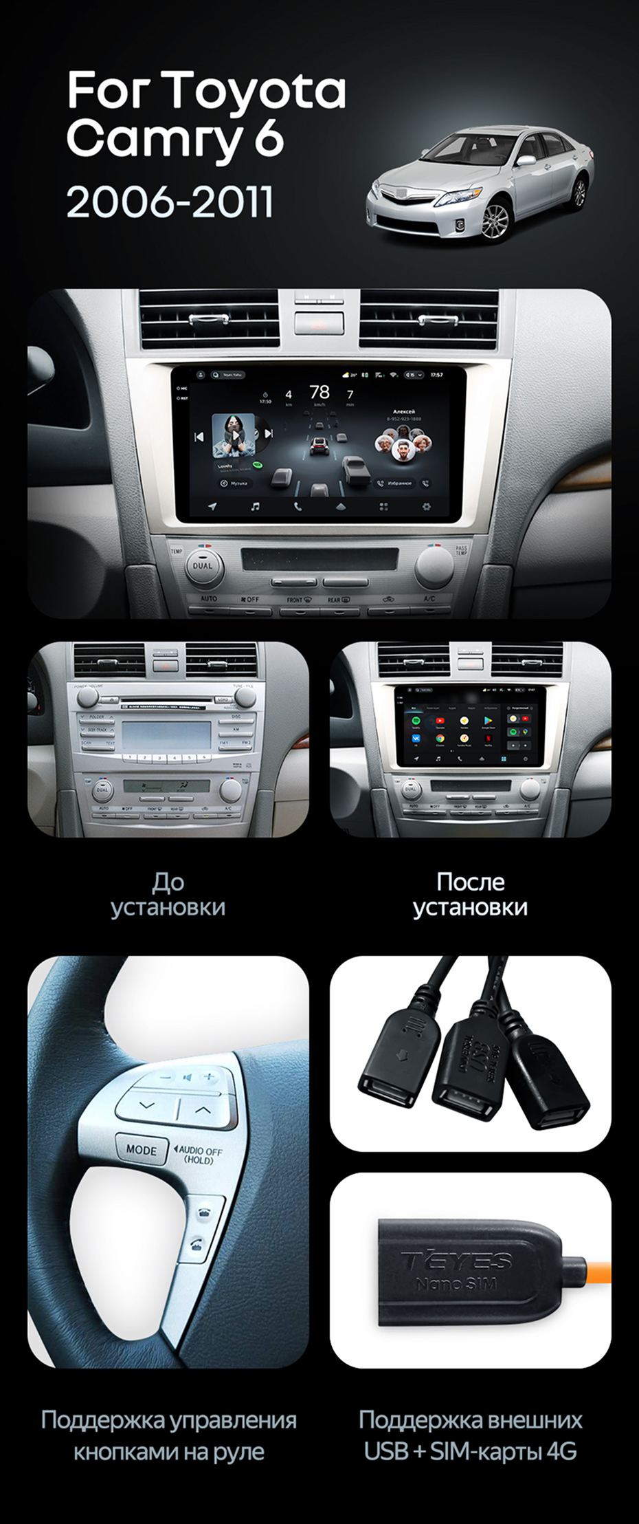 Штатная магнитола Teyes CC4 6/64 Toyota Camry 6 XV 40 (2006-2011) F1 - купить всего за 47 000 руб. в интернет-магазине в Ростове Teyes.com.ru. ✓ Самый лучший выбор мультимедиа ✓ Лучшая замена штатному ГУ ✓ Тел. +7 (800) 775-31-74