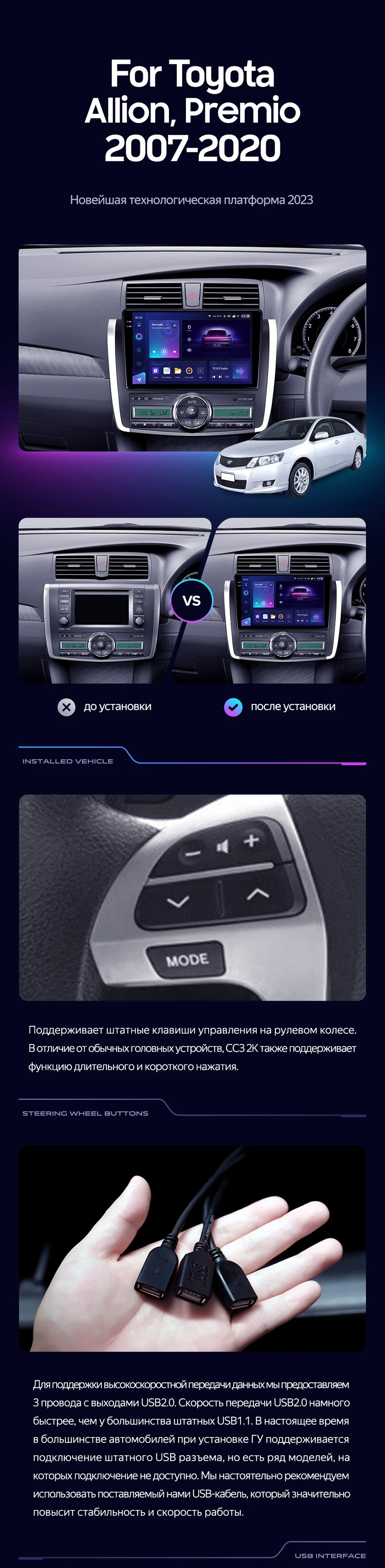 | USB | 3×USB 2.0 + USB 3.0 | Доп. аксессуары | Передняя/задняя AHD-камера, DVR-регистратор, TPMS, парковочный OBD, Type-C → HDMI |