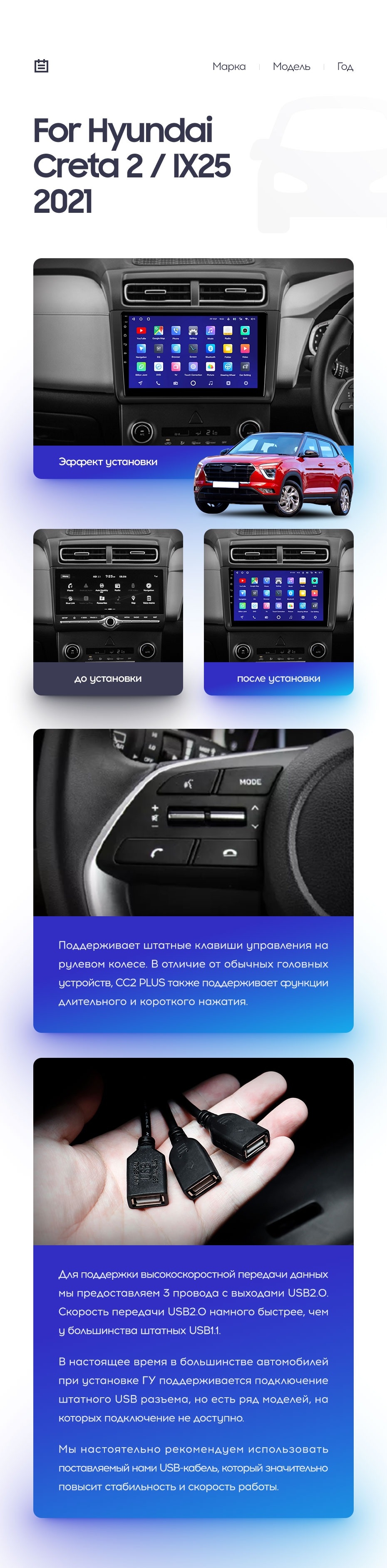 Полный комплект установки магнитолы Teyes с рамкой и проводкой можно выбрать в каталоге штатных магнитол Hyundai Creta 2 2021+.