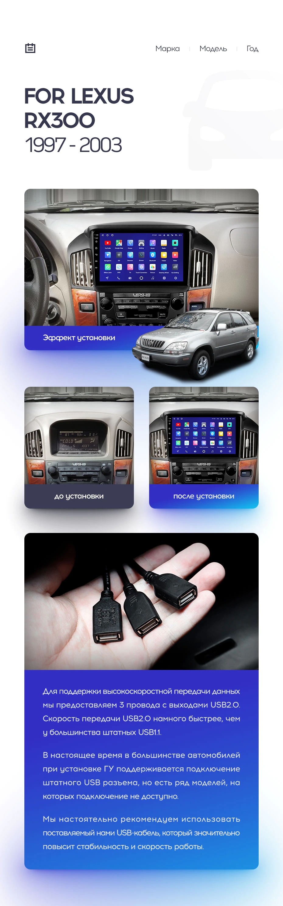Полный комплект установки магнитолы Teyes с рамкой и проводкой можно выбрать в каталоге штатных магнитол Lexus RX300 XU10 (1997-2003).
