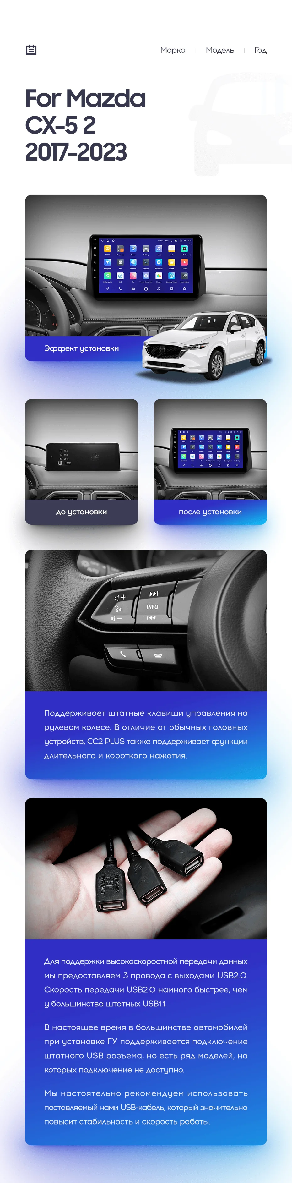 Полный комплект установки магнитолы Teyes с рамкой и проводкой можно выбрать в каталоге штатных магнитол Mazda CX-5 2 KF (2017-2023).