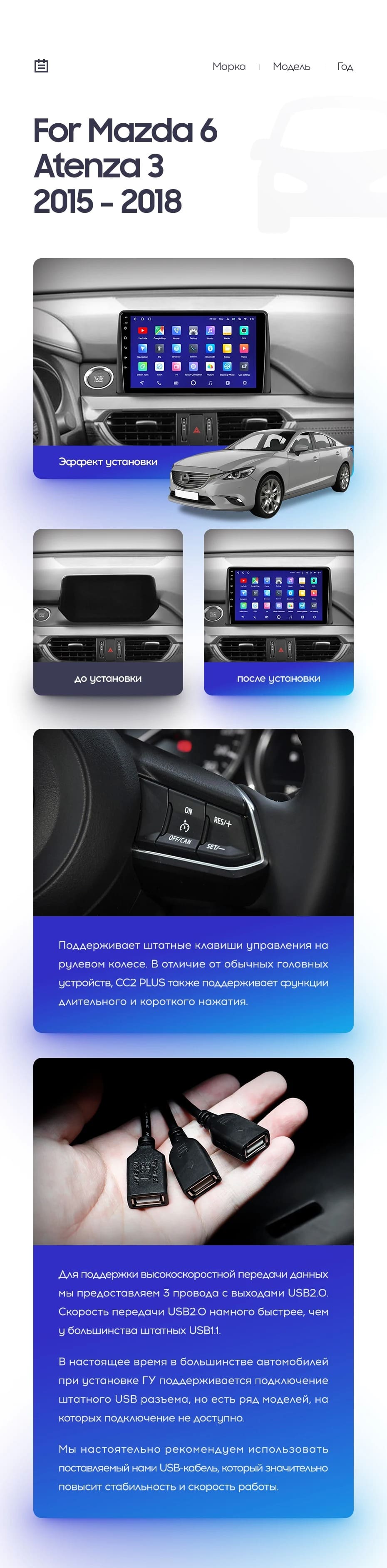 Полный комплект установки магнитолы Teyes с рамкой и проводкой можно выбрать в каталоге штатных магнитол Mazda 6 GJ GL (2015-2018).