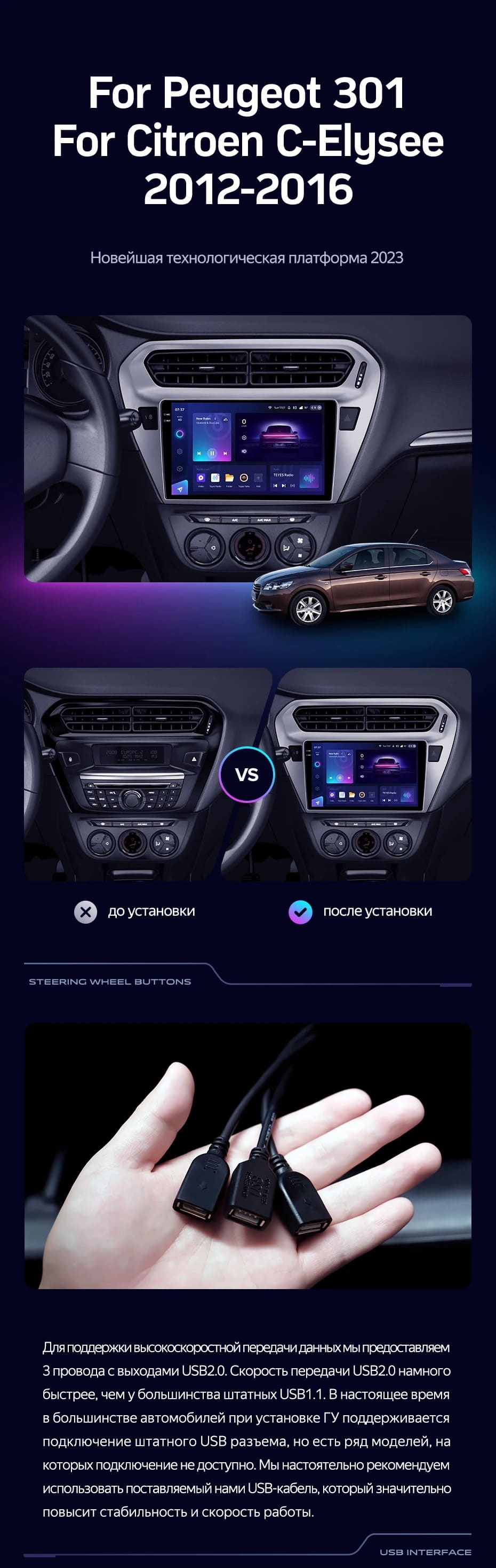 Полный комплект установки магнитолы Teyes с рамкой и проводкой можно выбрать в каталоге штатных магнитол Citroen C-Elysee (2012-2016).