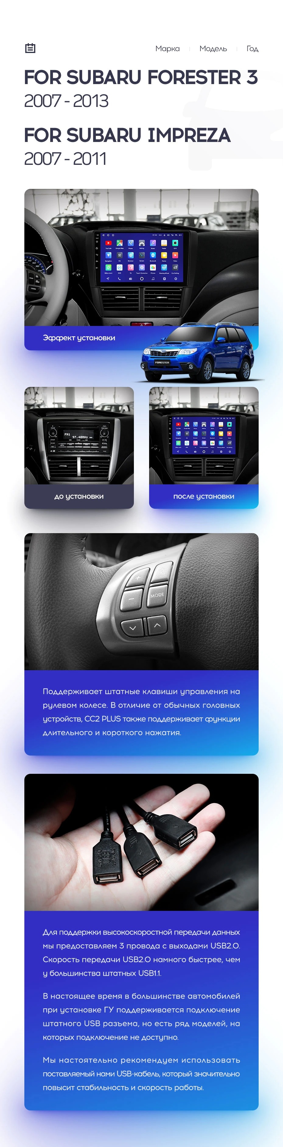 Полный комплект установки магнитолы Teyes с рамкой и проводкой можно выбрать в каталоге штатных магнитол Subaru Forester 3 SH (2007-2013).