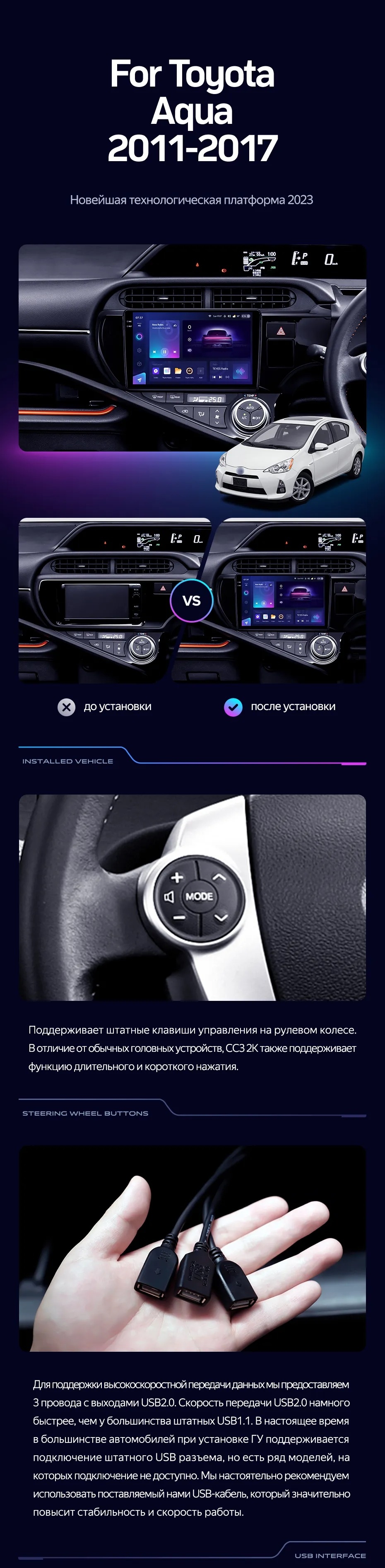 Полный комплект установки магнитолы Teyes с рамкой и проводкой можно выбрать в каталоге штатных магнитол Toyota Aqua (2011-2017).