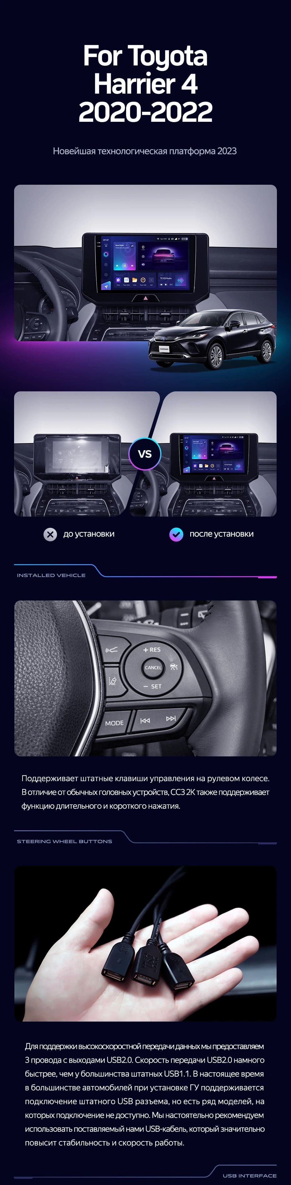 Полный комплект установки магнитолы Teyes с рамкой и проводкой можно выбрать в каталоге штатных магнитол Toyota Harrier 4 XU80 (2020-2022).