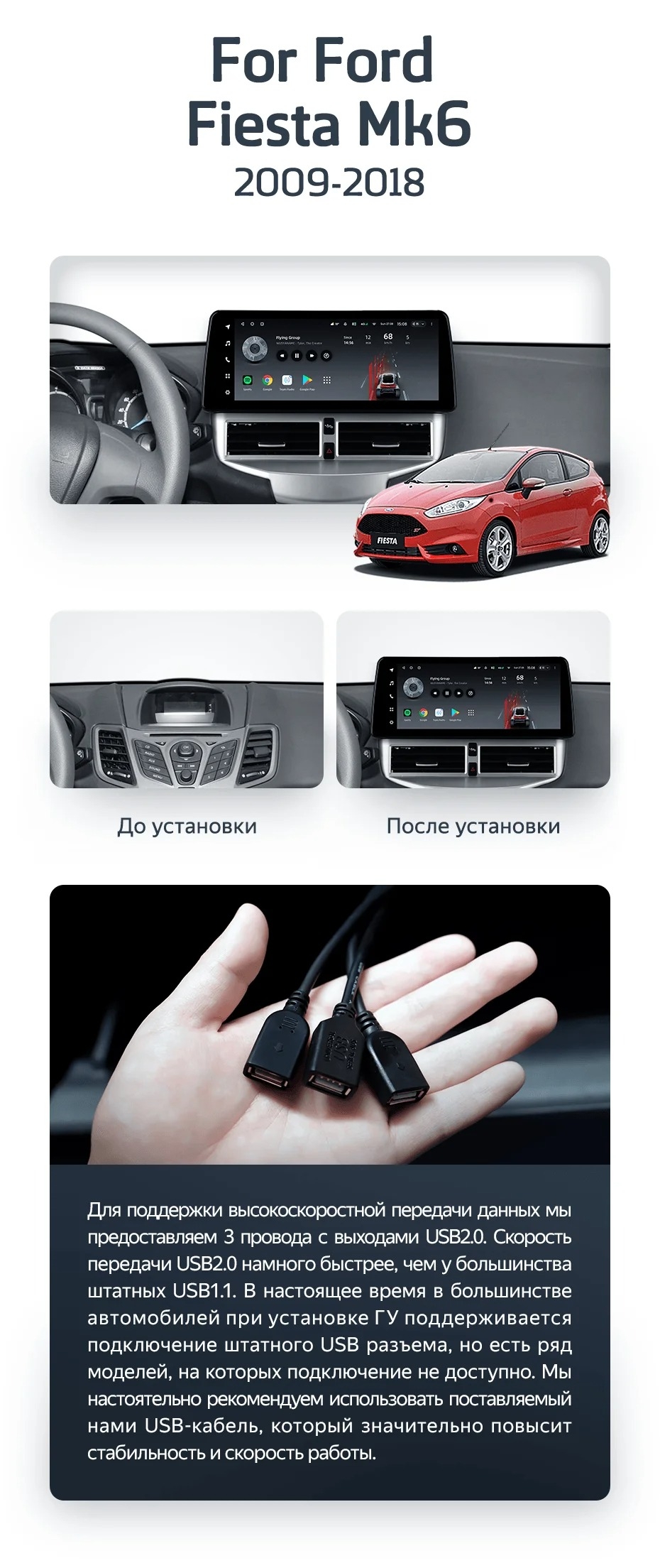 Полный комплект установки магнитолы Teyes с рамкой и проводкой можно выбрать в каталоге штатных магнитол Ford Fiesta Mk 6 (2009-2018).