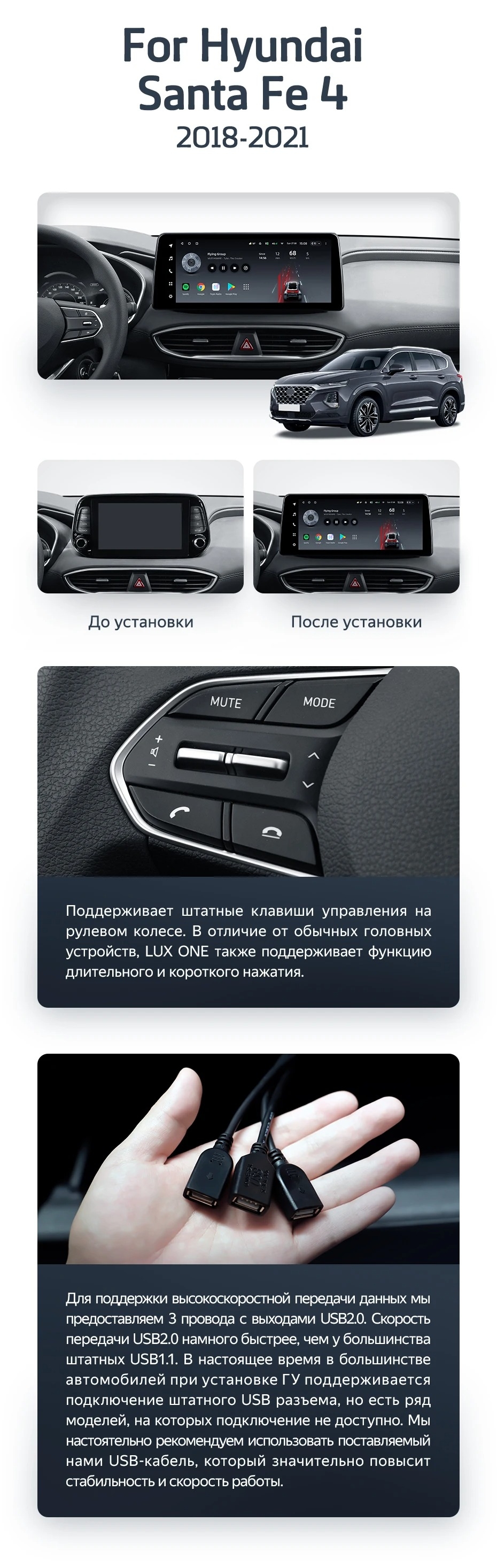 Установочный комплект для Hyundai Santa Fe 4 (2018-2021) включает переходную рамку и проводку.