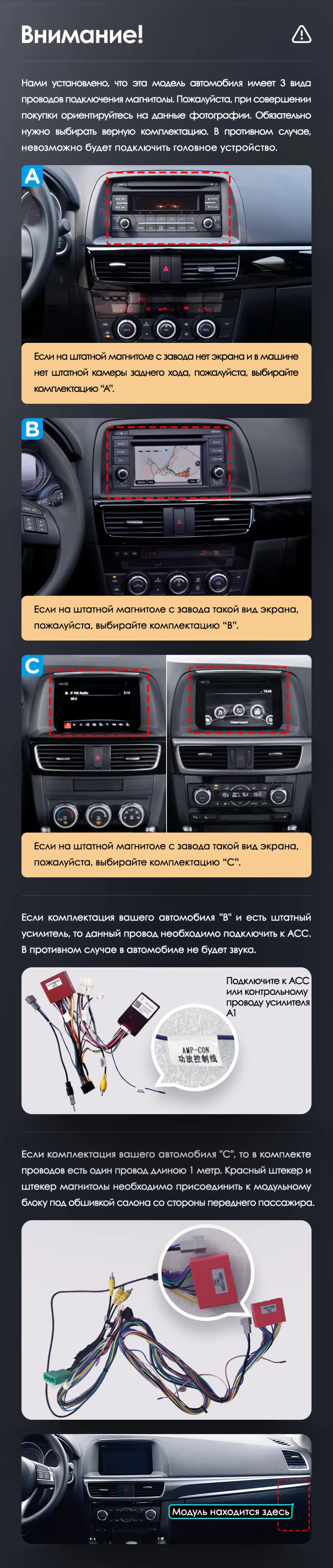 Установочный комплект для Mazda CX-5 (2012-2015) включает переходную рамку и проводку.